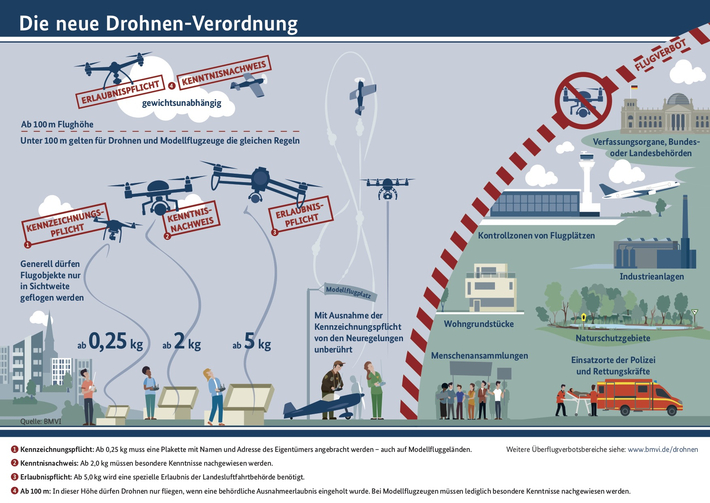Betriebsverbot: Ein Betriebsverbot gilt künftig für Flugmodelle und unbemannte Luftfahrtsysteme außerhalb der Sichtweite für Geräte unter 5 kg;